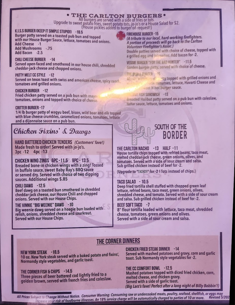 Pizza lovers will be pleased with Billy Bob Mike’s Pizza, offering creative combinations such as “Dueling Banjos” with Canadian bacon and pineapple, and the savory “Squeal Like A Pig” loaded with multiple meats. Each dish is crafted to deliver a hearty and satisfying experience, making Carlton Corners a true culinary gem in the area.